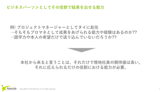 これは当たり前じゃないかと思われるかもしれませんが、意外とここがボトルネックになっています。例えばプロジェクトマネージャーとして外国に赴任する人がいたとします。その人はそもそも日本のビジネス環境でもプロマネとして結果を出せる能力はあるのでしょうか。能力は不足していても語学力や本人の希望だけで送り込まれていないでしょうか。これは非常に重要なポイントです。なぜなら本社から来るというだけで現地社員からの期待値は高くなります。さらに現地の社員は現地のプロジェクトや働き方に精通しています。日本からは上長として赴任する場合が多いのですが、当然上長には高い能力を求めることになります。そのような認識もなく、プロマネの能力がないまま赴任した場合、全くバリューを発揮できず、非常に肩身の狭い思いをすることになりかねません。結果を出せる能力があるかをシビアに判断されるので、赴任前も赴任後も足りないと思うことは向上心を持って学び、成長し続けることが求められています。