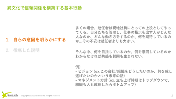 さらに異文化で信頼関係を構築するための基本行動として重要なもの2つを紹介します。