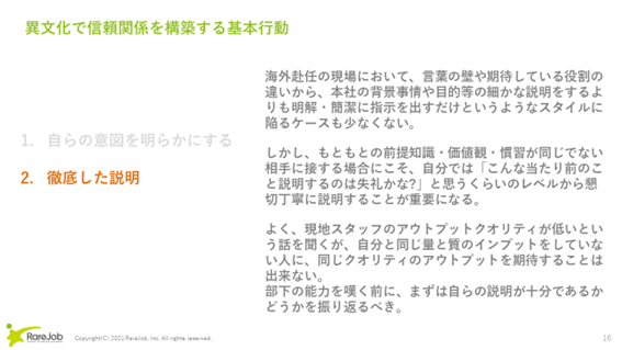 海外赴任の現場において、言葉の壁もあってか、本社の背景事情や目的等の細かな説明は飛ばして、明解・簡潔に指示を出すだけというようなスタイルに陥るケースも少なくありません。しかし、もともとの前提知識・価値観・慣習が異なる相手に接する場合にこそ、自分では「こんな当たり前のこと説明するのは失礼かな?」と思うくらいのレベルから懇切丁寧に説明することが必要です。