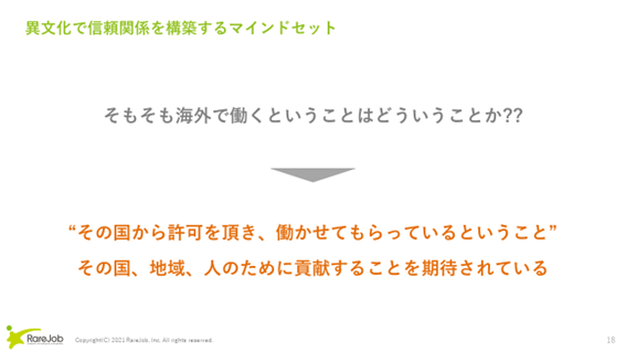 最後に異文化で信頼関係を構築するのに必要なマインドセットについてお話しします。