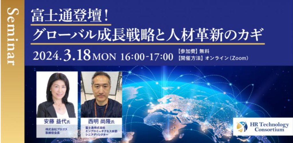 EdTechカンパニーの株式会社レアジョブ(以下、レアジョブ)の法人向け事業子会社である株式会社プロゴス(以下、プロゴス社)は、一般社団法人HRテクノロジーコンソーシアムが主催するオンラインウェビナー「富士通登壇!グローバル成長戦略と人材革新のカギ」に取締役会長 安藤が登壇することをお知らせいたします。